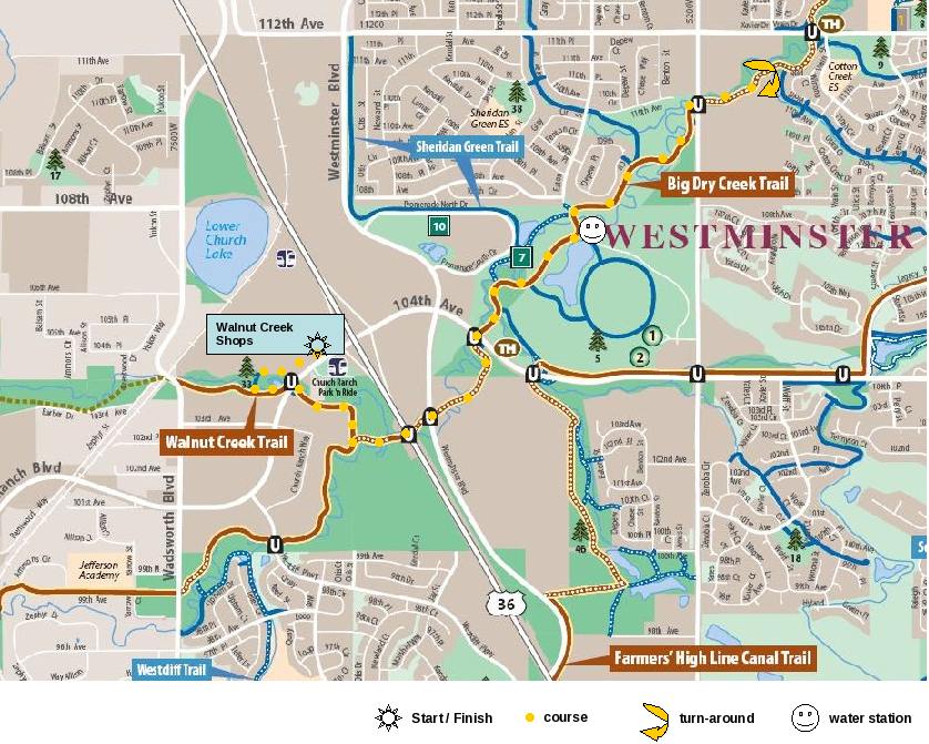 Directions: To reach the start, take the Boulder - Denver turnpike (36) toward Broomfield. Take the 104th Ave / Church Ranch Blvd exit and head west on Church Ranch Blvd. Turn right (North) at Town Center Drive. See the Google map for details. For information or to volunteer call Greg Ayres at 720-207-7333 or Jason Myers at 720-936-7860. |